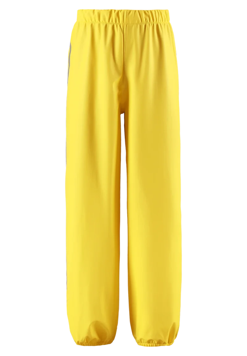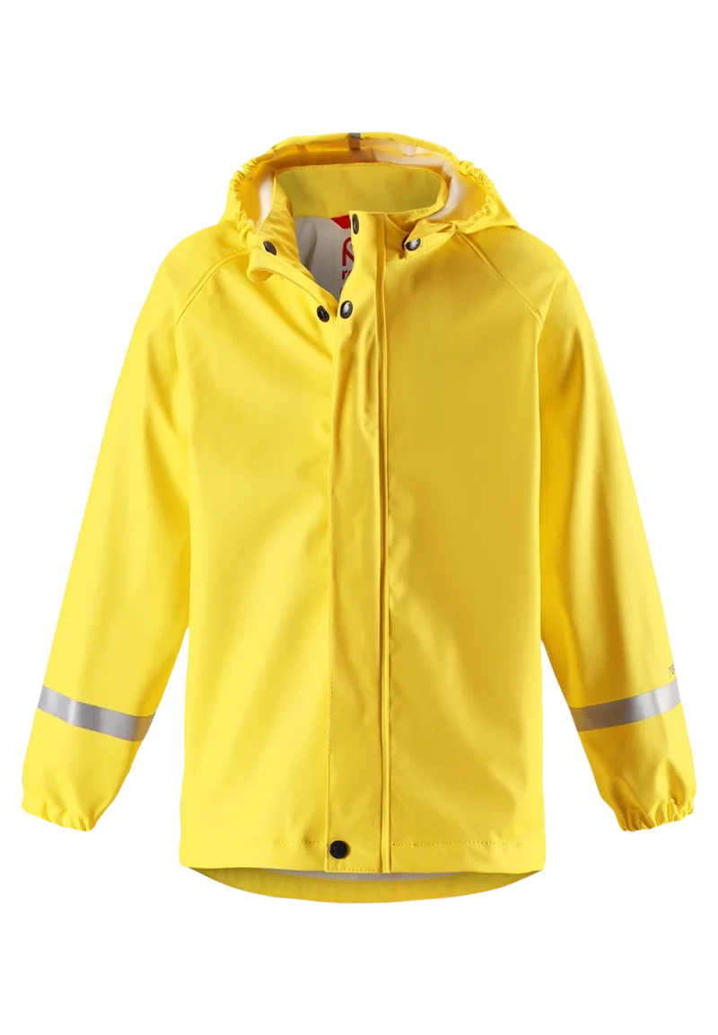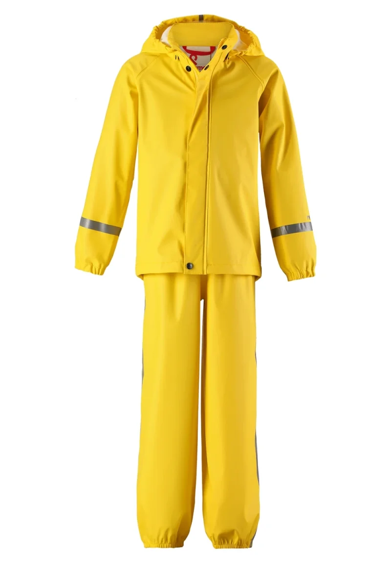 Dette traditionelle regnsæt til børn beskytter mod regn og mudder. Svejsede vandtætte sømme sikrer, at der ikke trænger vand ind. Den aftagelige hætte beskytter ikke bare mod regnen – den er også sikker ved udendørs leg i regnvejr. Hætten er fastgjort med trykknapper og rykkes nemt af, hvis den hænger fast i noget. Regnbukserne har elastiske fodender og talje. De mange refleksdetaljer sikrer, at de små eventyrere kan ses efter mørkets frembrud. Materialet er naturligvis PVC-frit.