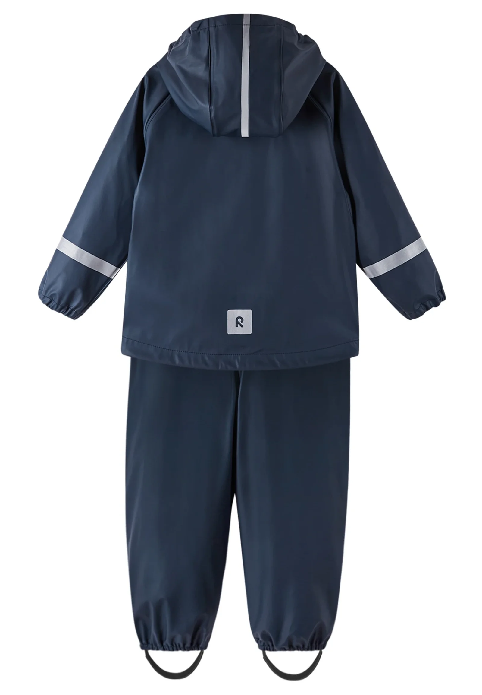 Lad det regne! Dette Reima-regnsæt uden for til små børn er perfekt til regnvejrsdage i foråret og efteråret. Det kan også anvendes på køligere dage, hvis du sætter varme mellemlag i. Svejsede vandtætte sømme sikrer, at der ikke trænger vand ind.