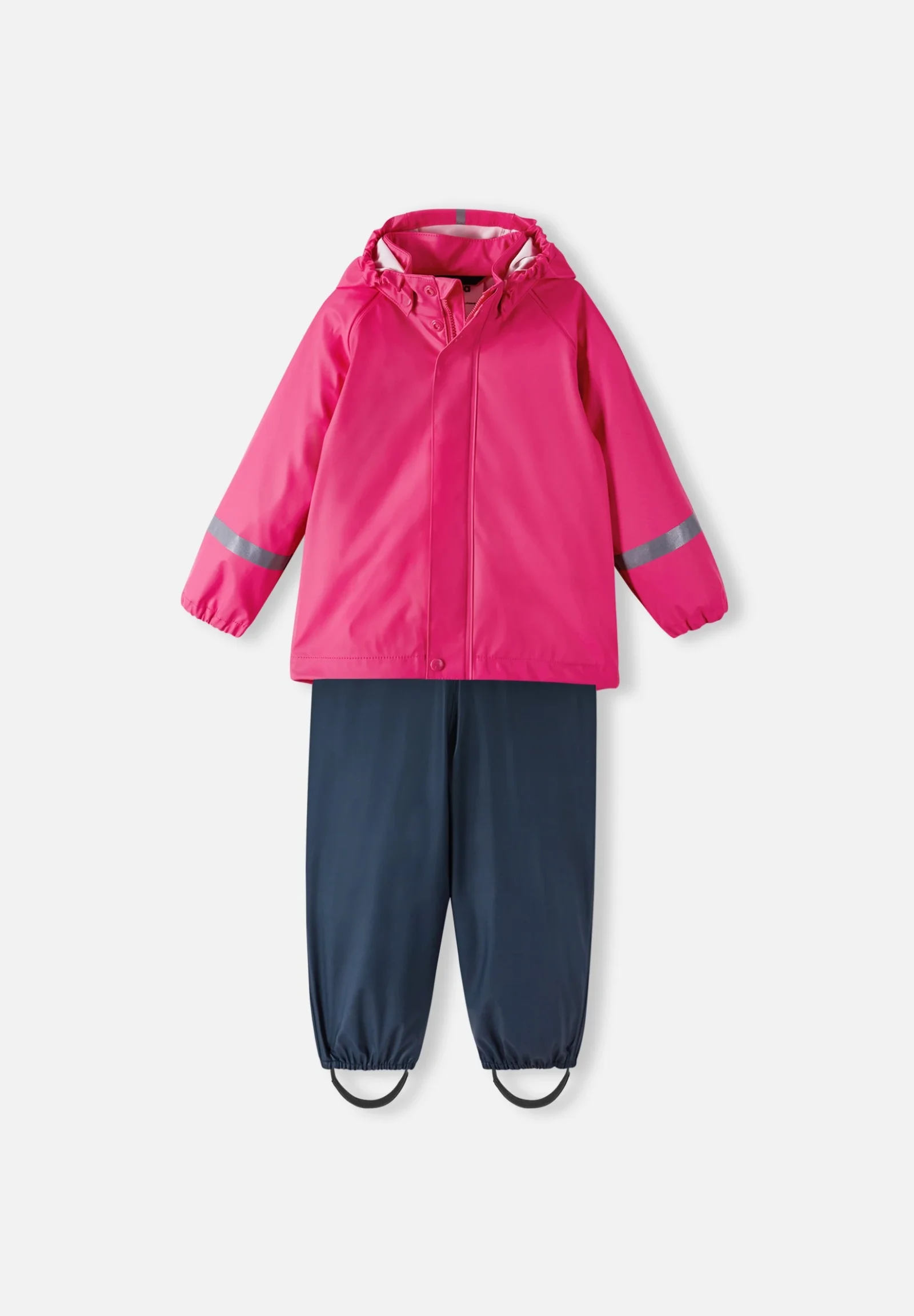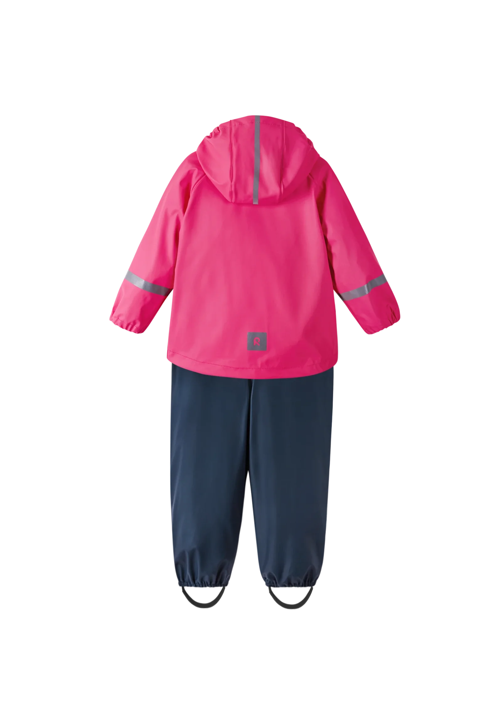 Lad det regne! Dette Reima-regnsæt uden for til små børn er perfekt til regnvejrsdage i foråret og efteråret. Det kan også anvendes på køligere dage, hvis du sætter varme mellemlag i. Svejsede vandtætte sømme sikrer, at der ikke trænger vand ind.