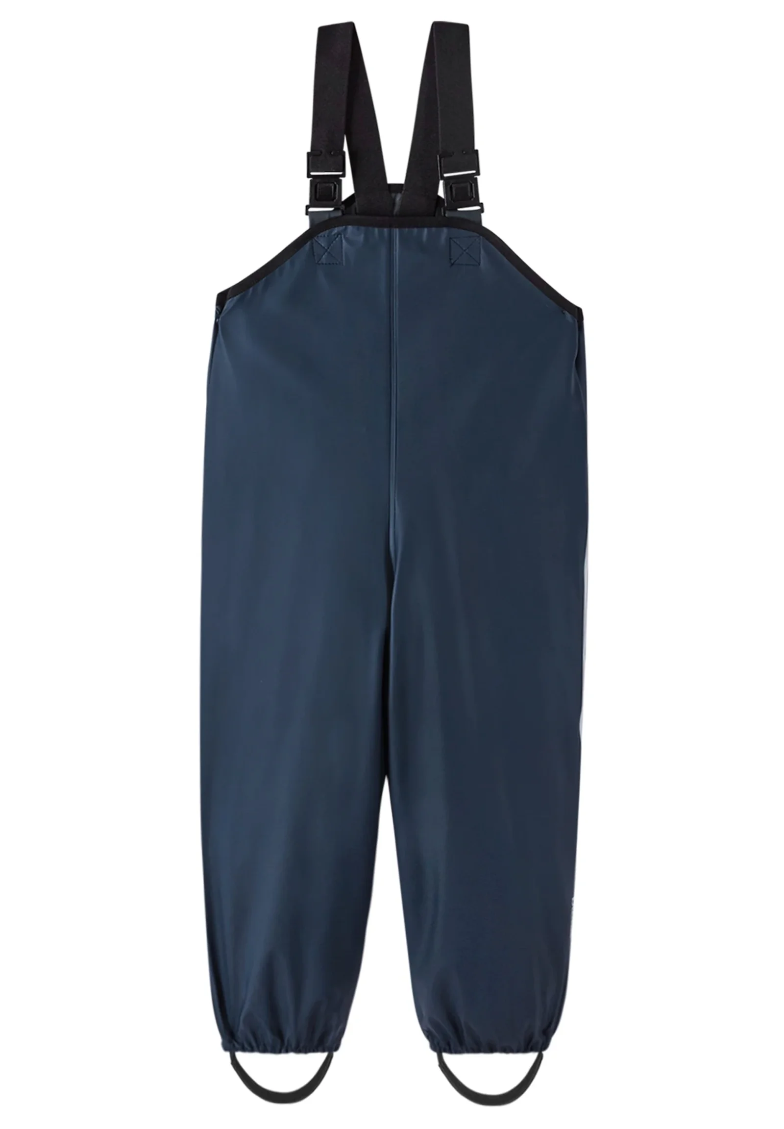 De elastiske og justerbare seler sørger for at holde regnbukserne oppe og sikrer en god pasform. De aftagelige fodstropper er nemme at placere under sålen på gummistøvler eller vandtætte sneakers, så buksebenene holdes på plads. Refleksdetaljerne sikrer, at de små eventyrere også er synlige efter mørkets frembrud i dette PVC-fri regntøj.
