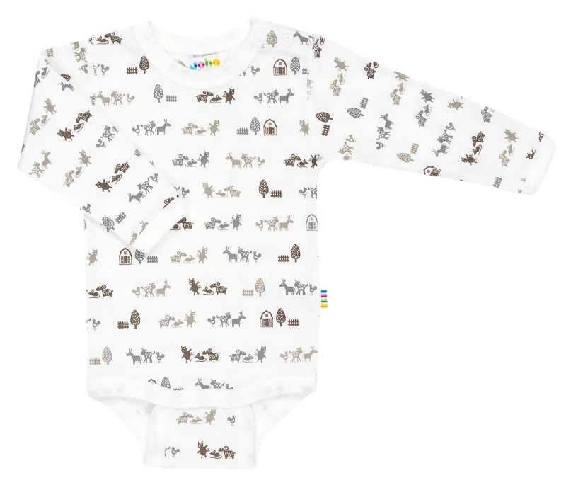 Rigtig fin body med lange ærmer i økologisk bomuld. Råhvid med print af dyre liv i dusede jordfarver. Lukkes med to trykknapper ved venstre skulder og tre forneden.