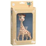 Sophie Giraf bliver hurtigt babys foretrukne legetøj, da hun besidder de bedste evner. Sophie Giraf er lavet af 100% naturgummi som er helt fri for BPA eller phthalater udelukkende udvundet fra Heveatræet, samt farvet med ugiftige plantefarver. Sophie er let at gribe fat i med sin lange hals og ben, og de bløde runde ører er behagelige for baby at gnaske på særligt når gummerne klør for tænder. De mørke pletter på Sophies krop fanger hurtigt babys blik og stimulerer synssansen.