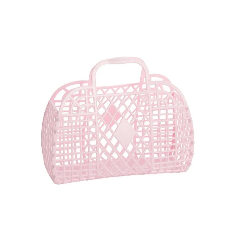 Sun Jellies retrotasker tager dig med tilbage til 80’erne. De flotte kurvetaske er lavet af 100% genanvendeligt plastik. Mønstret er det originale fra 1980'erne og konceptet er stadig det samme og samles ved hjælp af små plastdutter.Brug Sun Jellies tasken til opbevaring af legetøj, badetøj, strandlegetøj og andet nip eller som rigtig håndtaske.