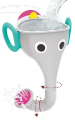 Elefanten kan tages af og fyldes i badekarret. Barnet kan let holde den i håndtagene på siden. Man kan også lade tragten blive på badekarret og bruge en kop til at hælde vand i den.