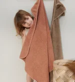 Det blødeste juniorhåndklæde med hætte i økologisk bomuld. Perfekt af putte sig i efter badet eller til udklædningslege.