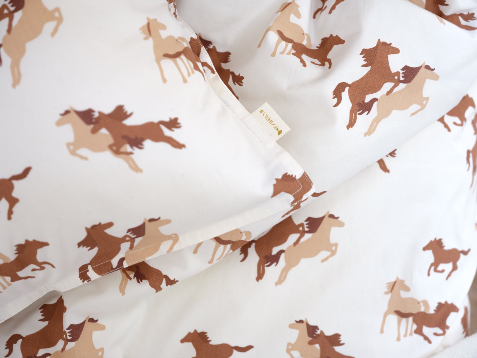 Oplev Fabelabs elegante sengetøj i creme med hestemotiv.