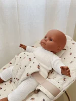 Dukke lavet af vinyl med økologisk bomuldsstof og fyld af genanvendt polyester. De hulstrikkede bukser og den hulstrikkede bluse i 100 procent økologisk bomuld er lette for barnet at tage af og på. Dukken har øjne der ser ægte ud, med dybde og farve.