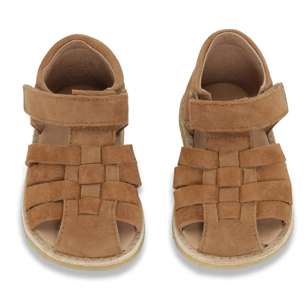 Sandal med lukket tå med kurveflettede remme og forstærket polstret hæl. Med en polstret indersål for ekstra komfort og en naturlig crepe gummisål.