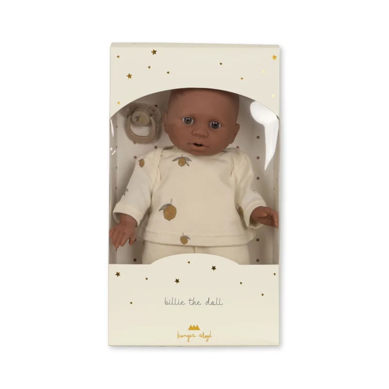 Super fin dukke lavet i vinyl med fyld af genanvendt polyester. Tøj lavet i økologisk bomuld og der medfølger en sut.