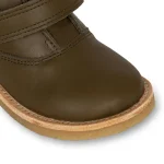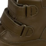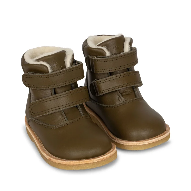 Klassisk skandinavisk vinterstøvle. Varme, vandtætte og åndbare støvler med såler af naturligt rågummi, udtagelige indersåler og uldfor. To velcroremme med O-ringe i antikt messing gør støvlerne lette at tage af og på. På siden har støvlerne påtrykt en citron i relief. TEX-membranen sikrer åndbarhed, komfort og isolering for barnets fødder hele dagen. Findes i ruskind og i læder.