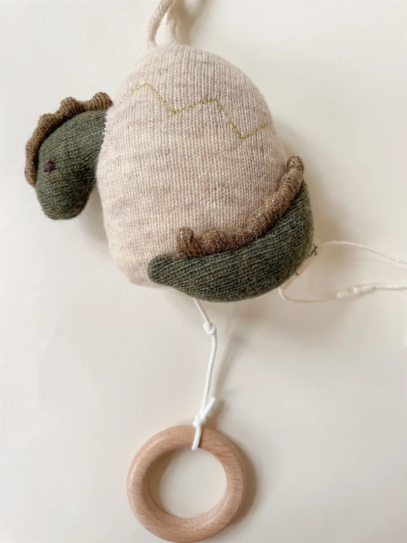 Musiklegetøj babydinosaur lavet af 80 % lammeuld og 20 % nylon, der spiller Brahms "Alfabetsangen". Designet med en strikke løkke til ophængning.