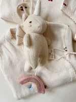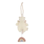 Musiklegetøj enhjørning lavet af 80 % lammeuld og 20 % nylon, der spiller en dejlig melodie. Designet med en strikke løkke til ophængning og en regnbue, der er let at holde fast i for små hænder.