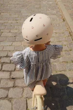 Konges Sløjd CykelhjelmSikkerhed først - men altid med stil. Konges Sløjd's cykelhjelm har praktisk størrelsesjustering, easy grip, en smal skygge foran, så de små øjne ikke generes af lys, og ekstra synlighed i form af reflekser. To ventilationshuller på toppen af hjelmen og to bag på hjelmen, samt aftagelig polstring fastgjort med velcro.