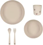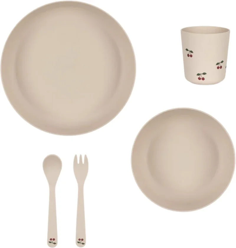 Middagssæt fremstillet af 100 % PLA (bioplast). Sættet indeholder én tallerken, én skål, en kop, 1x bestiksæt.