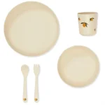 Middagssæt fremstillet af 100 % PLA (bioplast). Sættet indeholder én tallerken, én skål, en kop, 1x bestiksæt.