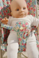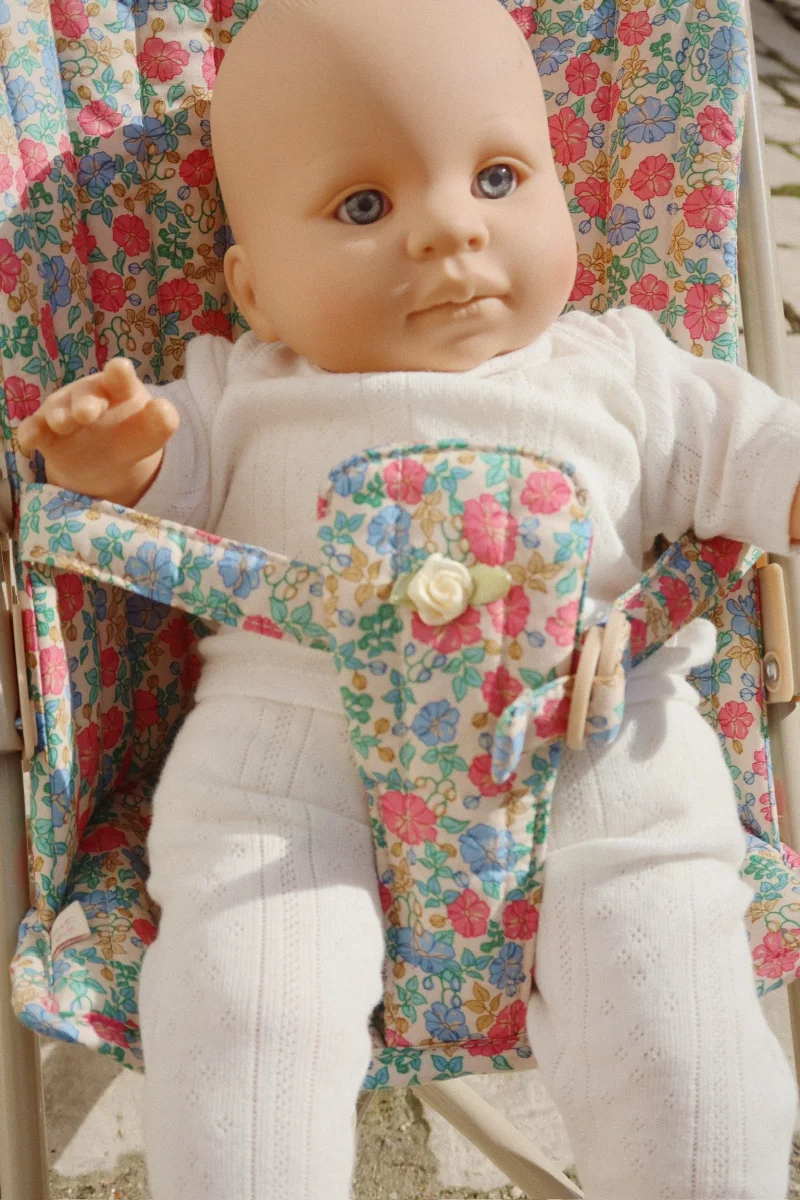 Dukkevogn med tilhørende sele, taske og dobbelthjul på alle fire ben for at skabe ekstra stabilitet. Aftageligt stof fremstillet af 100 procent økologisk bomuld medfølger. Kommer færdigmonteret. Nem at folde sammen og opbevare. Stellet er lavet af jern beklædt med blødt EVA-materiale på håndtagene.