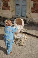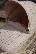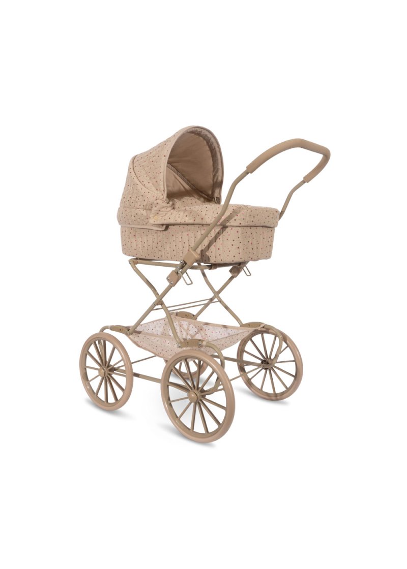 Dukkevogn i retrostil med fire store hjul, der gør den nem og stabil at køre med. Dukkevognen er lavet i quiltet stof og har fine muslingekanter. Dukkevognen har en blød madras og en polstret opbevaringskurv forneden. Stellet er lavet af metal med bløde skumhåndtag. Dukkevognen leveres samlet og er nem at folde sammen og pakke væk. Materialer: Hovedmateriale 100 % polyester, fyld 100 % polyester, for 100 % bomuld, stel 100 % jern Mål: H: 90 x B: 71 x L: 41 cm Egnet fra 3 år ADVARSEL! KVÆLNINGSFARE. Små dele. Ikke egnet til børn under 3 år.