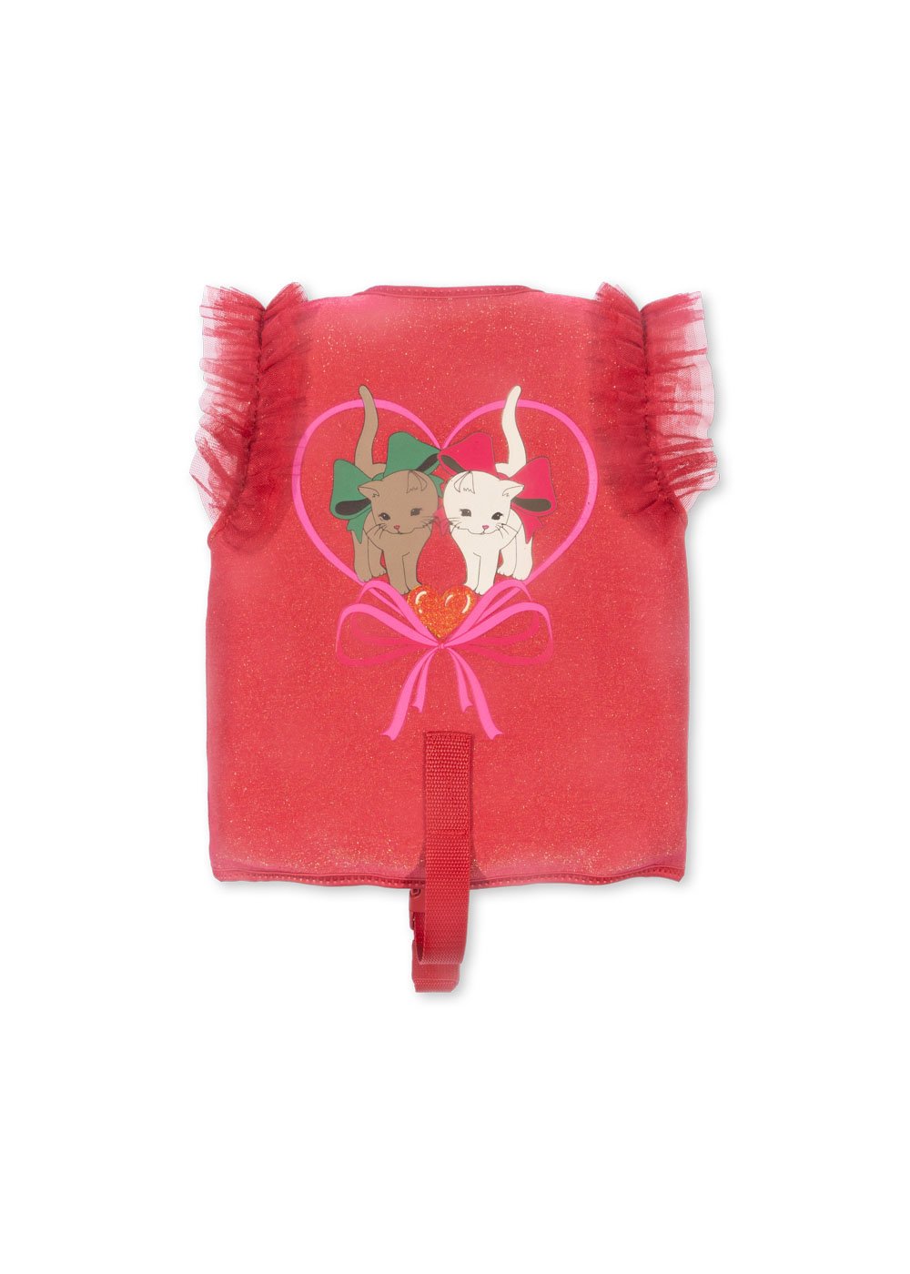 Svømmevest med glimmereffekt og flæser på skuldrene. Har både lynlås og velcrolukning samt en sikkerhedsrem med spænde i skridtet.