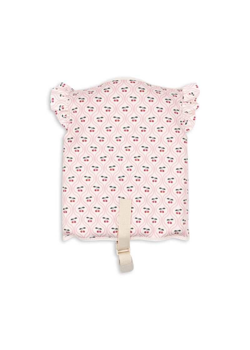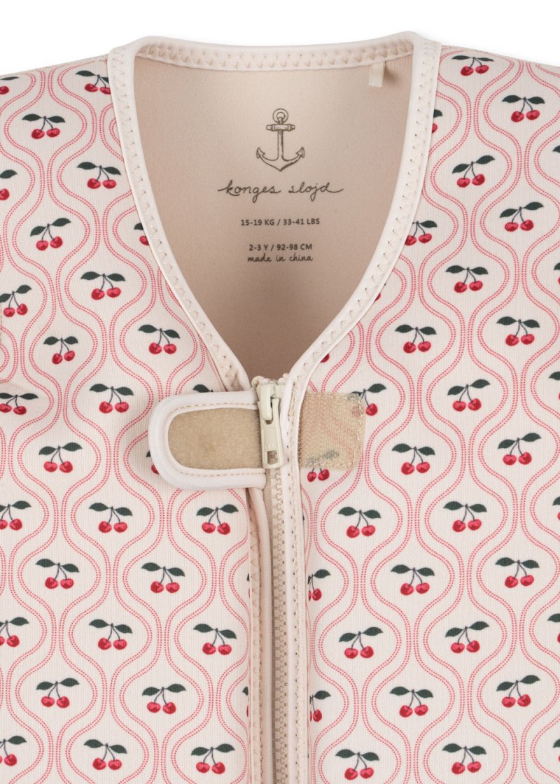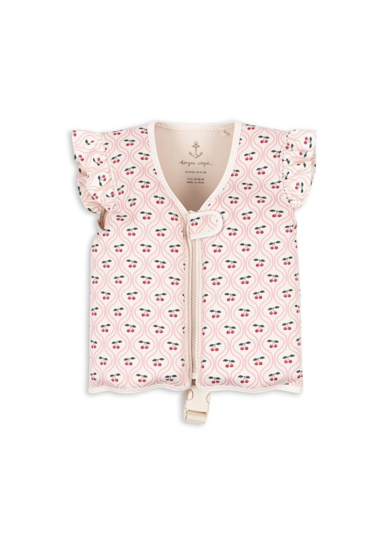 En svømmevest fra Konges Sløjd med kirsebærmønster. Vesten har et dobbelt lukkesystem med lynlås og spænde samt rynkede ærmer og V-hals.