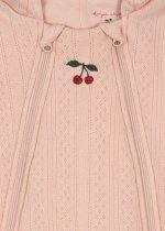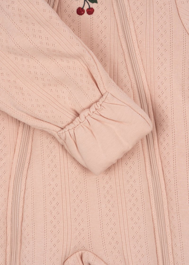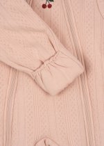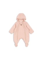 Vatteret heldragt med dekorativt hulmønster. Heldragten har hætte og fødder. Lukkes med to lynlåse foran. Materialer: Hovedmateriale 100 % bomuld, polstring 100 % polyester Dette produkt er certificeret i henhold til OEKO-TEX® STANDARD 100, klasse 1 af DTI Tekstil, DTI 2276-361.