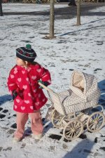 En mindre version af Konges Sløjd's dukkevogn i vintagestil, der er let at køre med for små dukkeforældre.