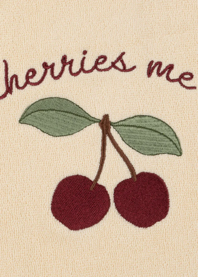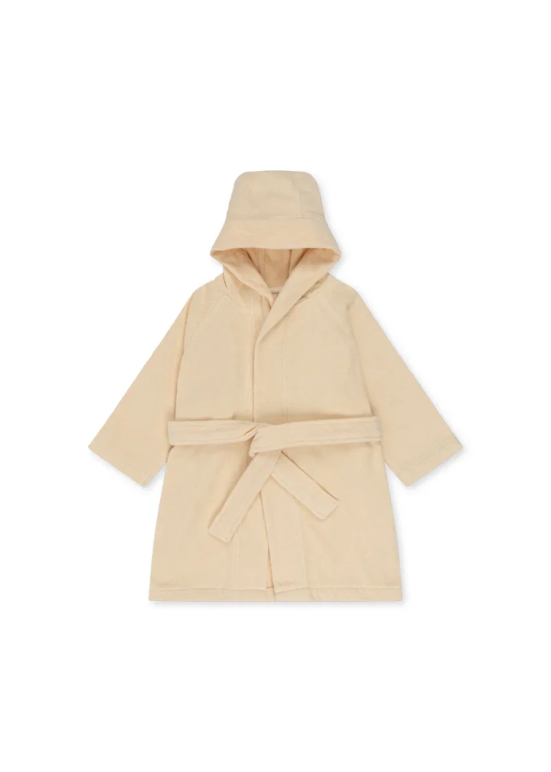 Badekåbe med hætte, dekorativt broderi og aftageligt bælte.