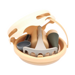 Et komplet spand-sæt i håndtaskestørrelse med udvalg af grave-, formnings-, sigte-, rive- og transportsandlegetøj.