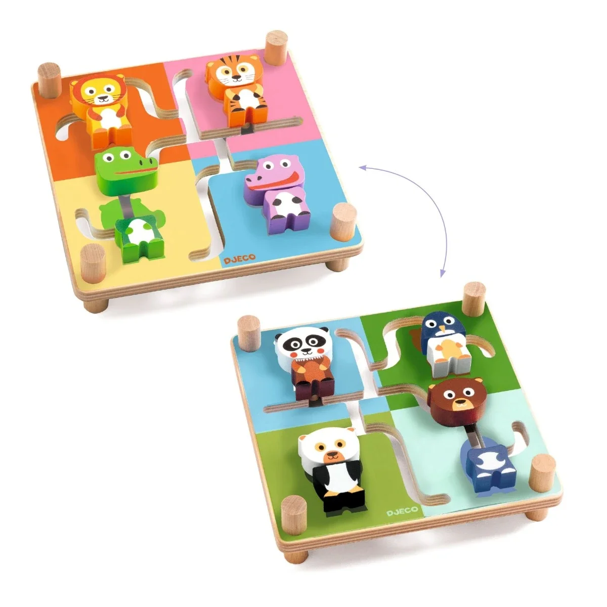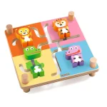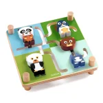 Her gælder det om at få samlet de 4 dyr i hvert sit rigtige hjørne. Hvert dyr består af to dele, der skal føres sammen det rigtige sted. Når de 4 dyr er samlet korrekt, vender du den om, om 4 nye dyr på bagsiden trænger nu til at blive sat rigtig sammen. Og sådan kan man blive ved i en uendelighed. Et sjovt motorisk og udfordrende spil fra Djeco.