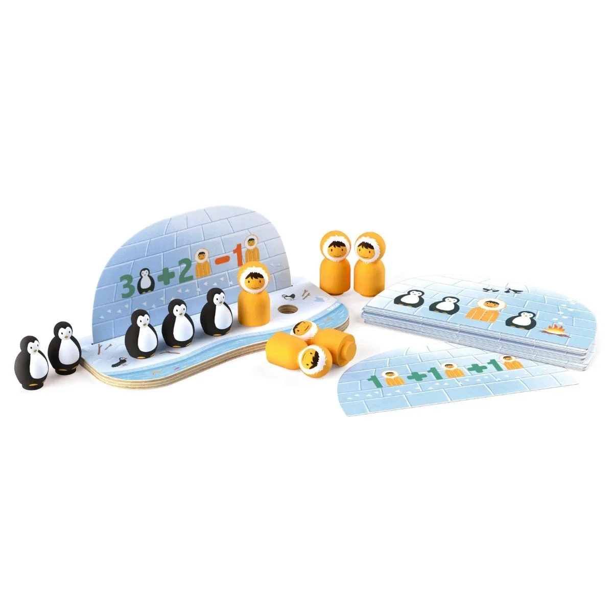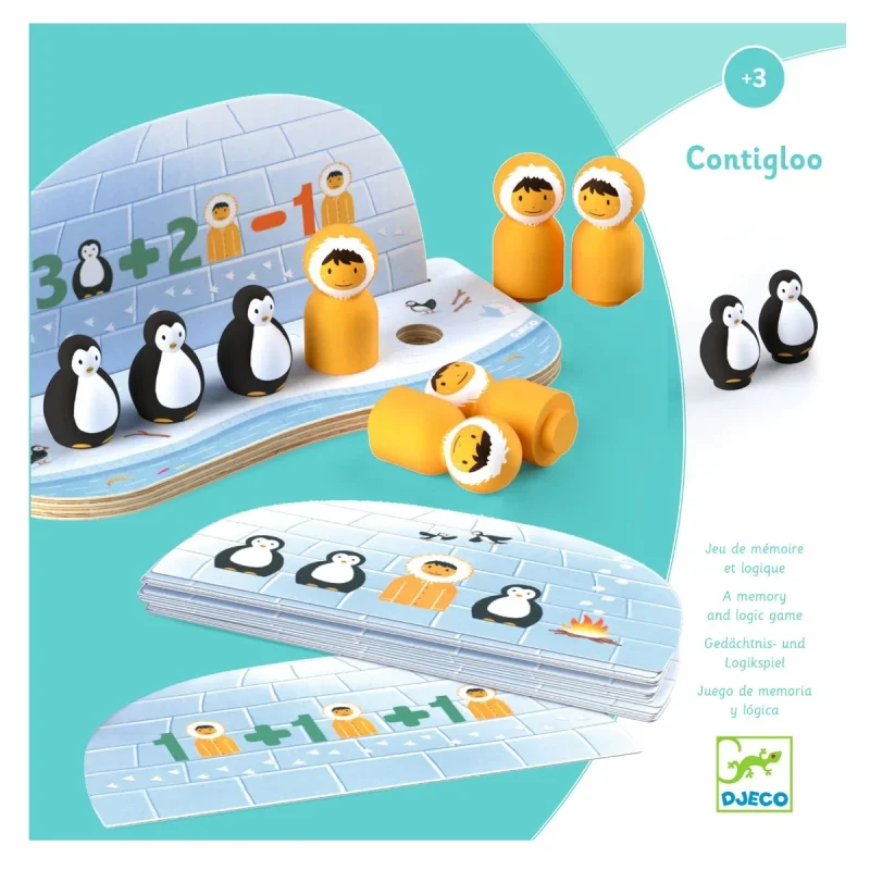 Contigloo er et spil hvor du øver dig i at lægge til og trække fra. Tag et kort og sæt det i holderen. Kortet giver instruktioner, og det rigtige antal brikker lægges efterhånden på brættet. Bagsiden af kortet afslører løsningen på billedet og om du har gjort det korrekt.