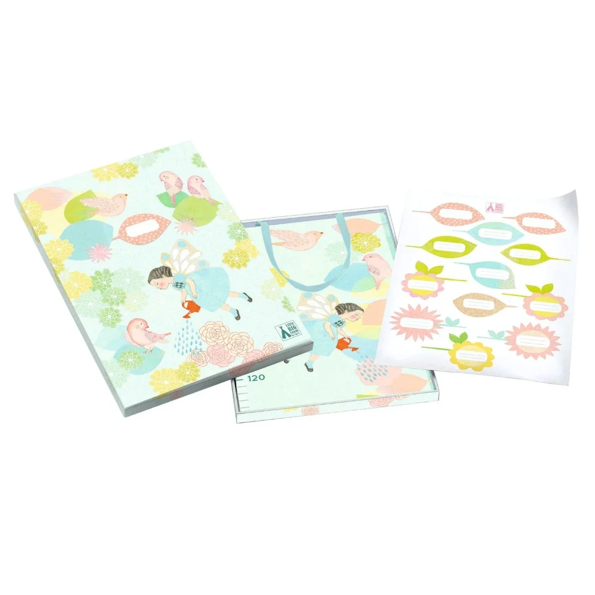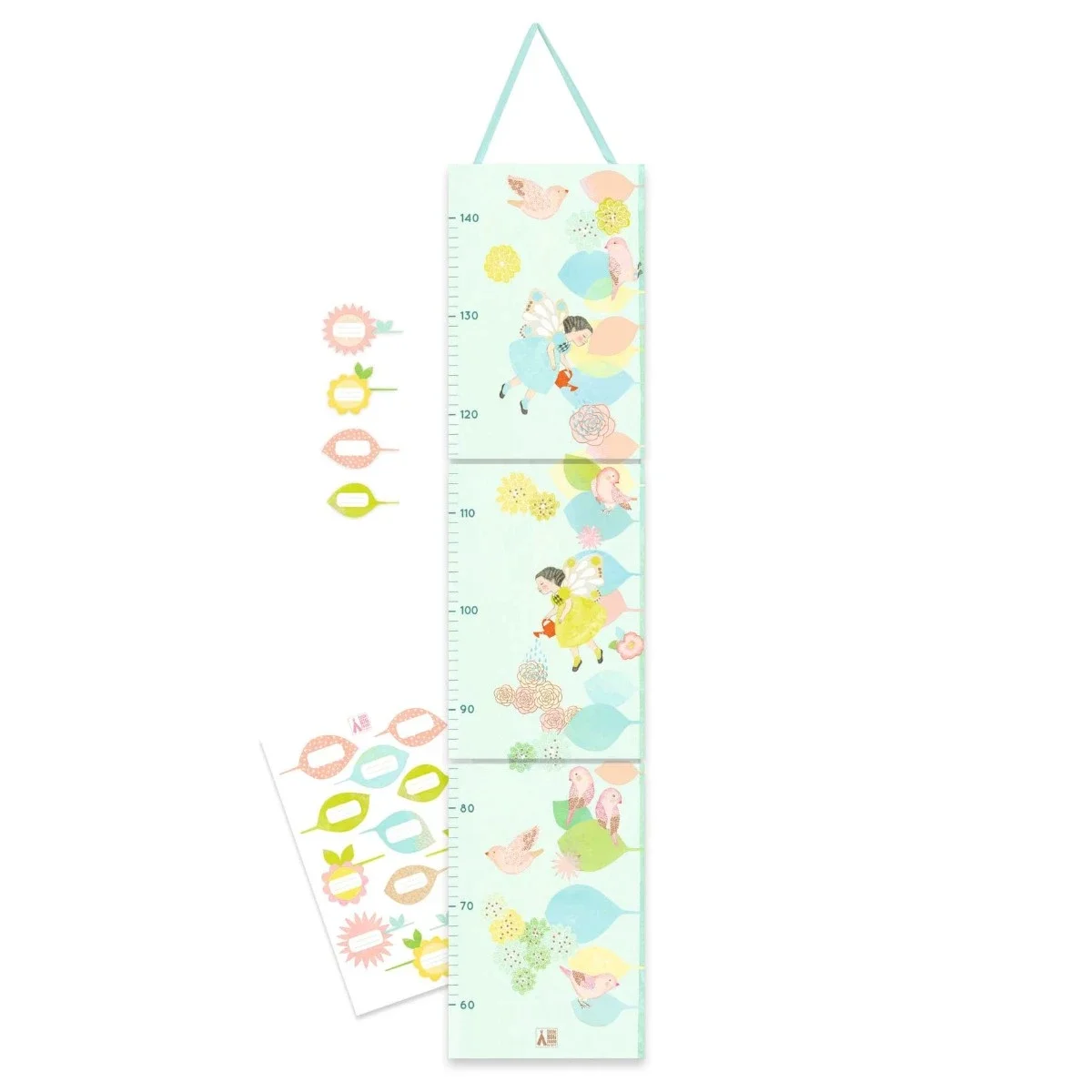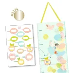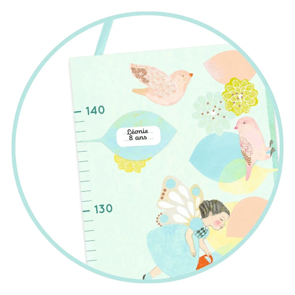 DjecoŽs højdemåler er lige til at folde ud og hænge op på væggen. På de medfølgende stickers kan man notere barnets navn og dato , som klæbe på højdemåleren så man kan følge med i barnets udvikling.