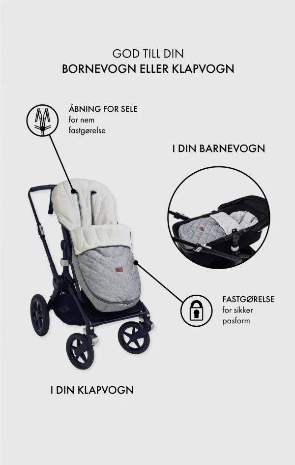 Den unikke form på Najell Køreposen gør det muligt at bruge den fra første dag og op til 3 år. Så når barnet er vokset ud af SleepCarrier’en, kan du fortsætte med at bruge den i barnevognen og efterfølgende i klapvognsdelen.