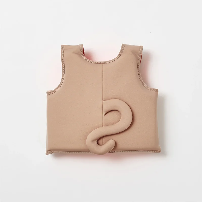 Sunnylife svømmevest med brede skulderstropper. Vesten åbnes foran med lynlås med hagebeskytter. OBS: Svømmevesten er ikke en redningsvest.Svømmevesten hjælper barnet med at holde sig flydende, men skal være under opsyn.