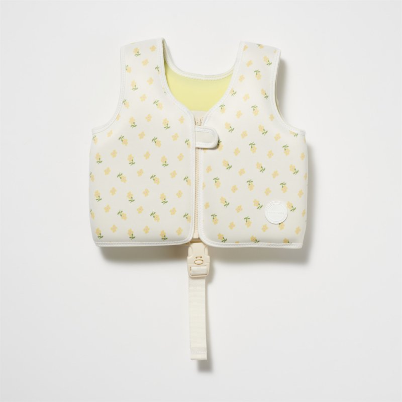 Sunnylife svømmevest med brede skulderstropper. Vesten åbnes foran med lynlås med hagebeskytter. OBS: Svømmevesten er ikke en redningsvest.Svømmevesten hjælper barnet med at holde sig flydende, men skal være under opsyn.