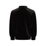 Sejeste jakke i sort med fine prikker i guld over det hele. Den åbnes og lukkes med en lynlås i guld foran.