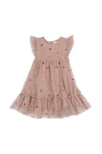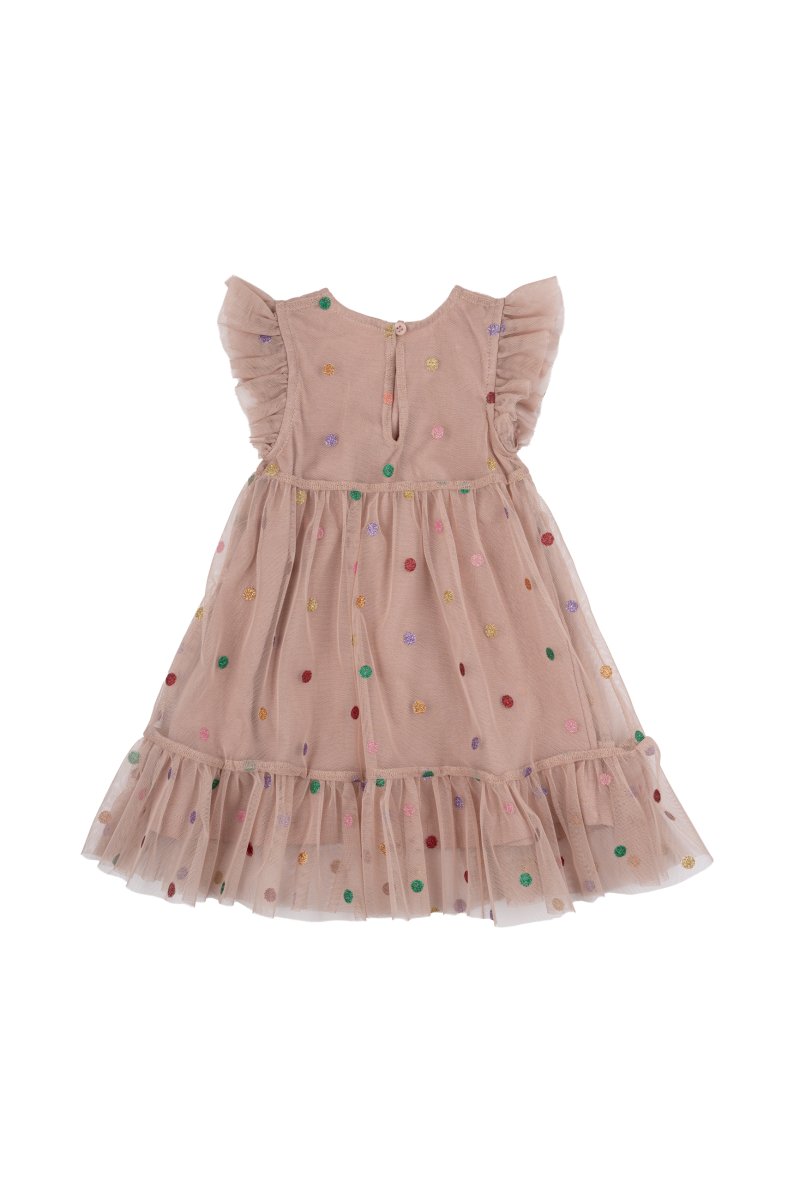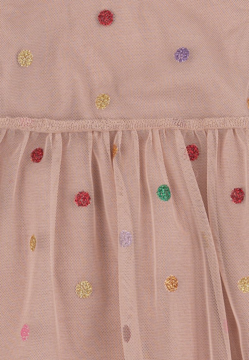 Denne charmerende kjole i to lag består af en underkjole i blødt og åndbart bomuld, samt et ydre lag af blødt, gennemsigtigt mesh-stof med farverige prikker.