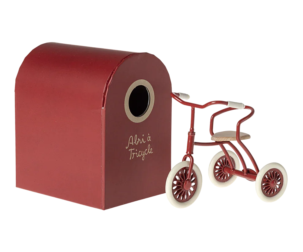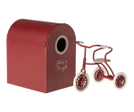 Denne cykel passer perfekt til leg med Maileg. Mus med magneter i hånden kan nemt holde styret. Denne smukke cykel kommer med en garage til at udvide legen. Passer bedst til storebror/søster mus.