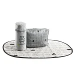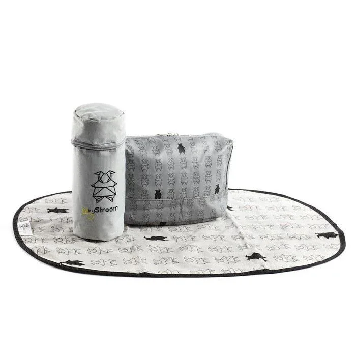 Indeholder underlag, toilettaske samt flaskeholder. Puslekittet er nemt at rengøre. Leveres i enkel unisex grå farve og er med som standard tilbehør i de fleste af byStrooms pusletasker.