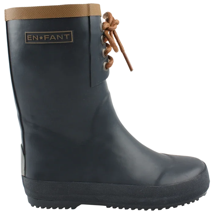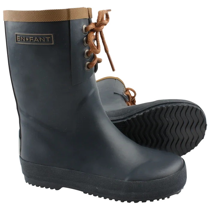 Super flotte og praktiske gummistøvler i naturgummi fra En Fant. Navy gummistøvler med logo på siden samt snøre øverst. Støvlerne har en god rillet gummisål samt udtagelig indersål.
