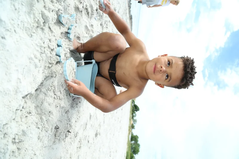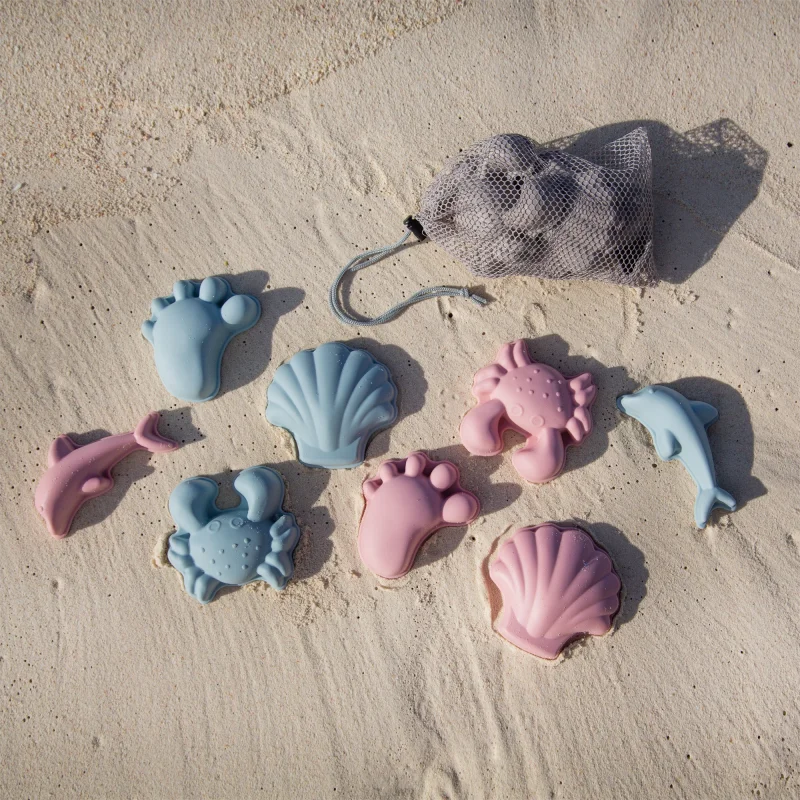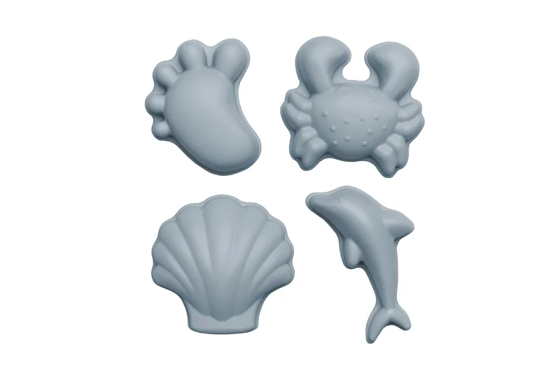Scrunch-moulds er fire små, fine sandforme i silikone, som små hænder har let ved at gribe om og lave sandfigurer med. De fylder ingenting i taskene eller kufferten og de passer godt sammen med de andre Scrunch-produkter. Her et sæt med fire i en støvet lyseblå, der passer til andre produkter fra Scrunch i samme farve.