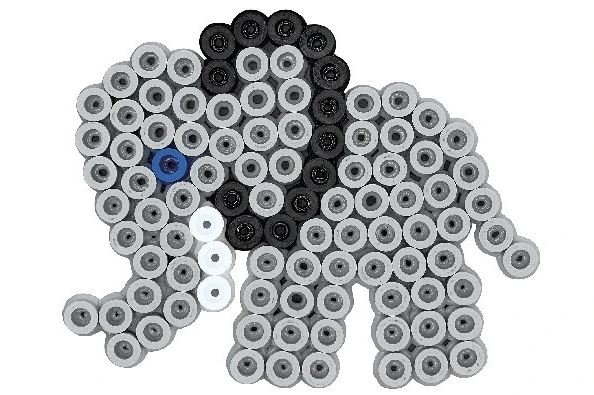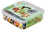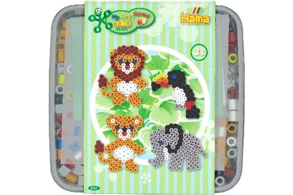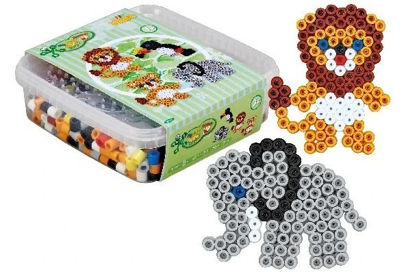 Bøtten indeholder ca. 600 maxi perler ass. farver, 2 gennemsigtige stiftplader: løve nr. 8229 og lille elefant nr. 8230. Motivark, vejledning og strygepapir.