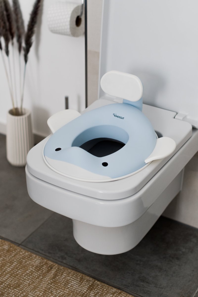 Børnetoiletsædet kan bruges universelt på standard toiletsæder og har en ekstra stænkbeskyttelse og en skridsikker bund.