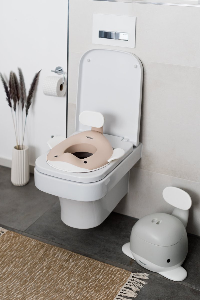 Børnetoiletsædet kan bruges universelt på standard toiletsæder og har en ekstra stænkbeskyttelse og en skridsikker bund.