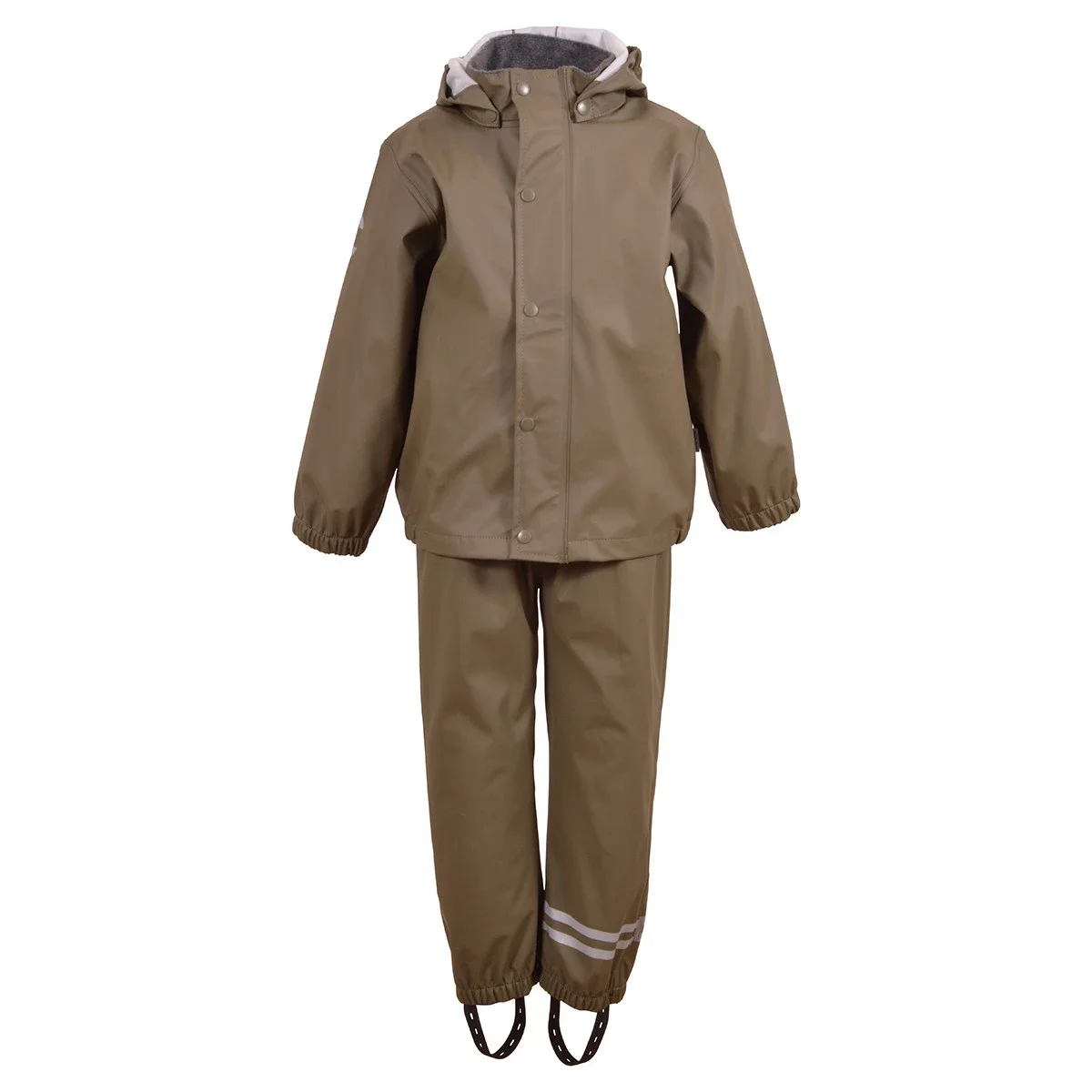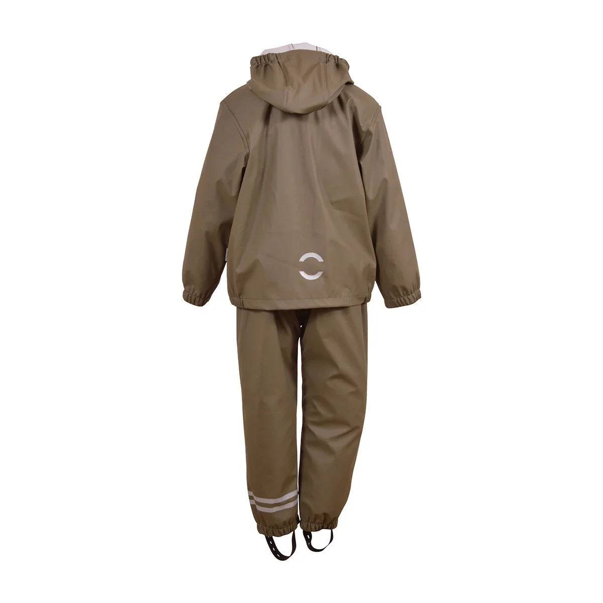 Sættet består af jakke samt bukser.Regnjakken har en gennemgående lynlås samt knapper foran. Der er aftagelig hætte, som sider fast med knapper. Der er elastik kanter omkring håndleddene samt i åbningen på hætten.På begge ærmer samt nederst på ryggen er der en refleks, så barnet lettere bliver set i de mørke timer.
