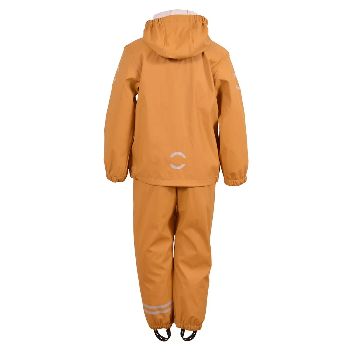 Der er elastikstropper under fødderne, som kan sættes under gummistøvlerne, så regnbukserne ikke glider op ved f.eks. leg.Nederst på venstre ben er der to striber refleks, for god synlighed.
