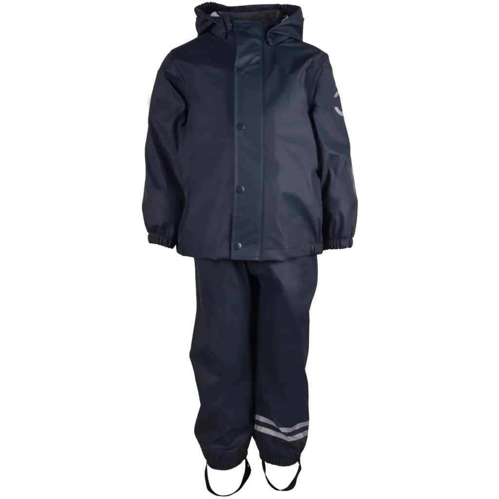 Sættet består af jakke samt bukser. Regnjakken har en gennemgående lynlås samt knapper foran. Der er aftagelig hætte, som sider fast med knapper. Der er elastik kanter omkring håndleddene samt i åbningen på hætten.På begge ærmer samt nederst på ryggen er der en refleks, så barnet lettere bliver set i de mørke timer.