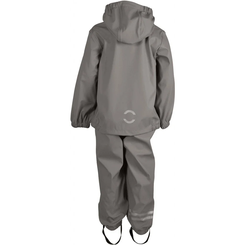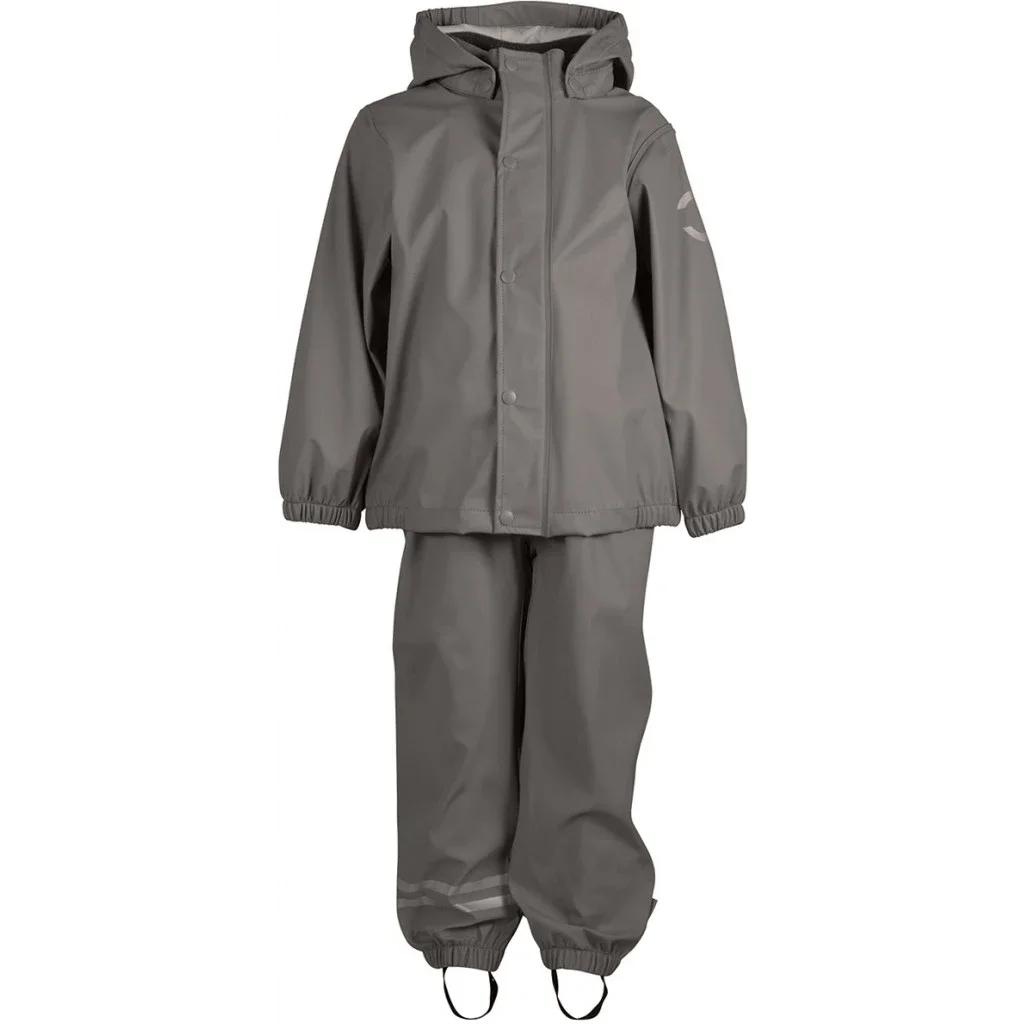 Sættet består af jakke samt bukser. Regnjakken har en gennemgående lynlås samt knapper foran. Der er aftagelig hætte, som sider fast med knapper. Der er elastik kanter omkring håndleddene samt i åbningen på hætten.På begge ærmer samt nederst på ryggen er der en refleks, så barnet lettere bliver set i de mørke timer.
