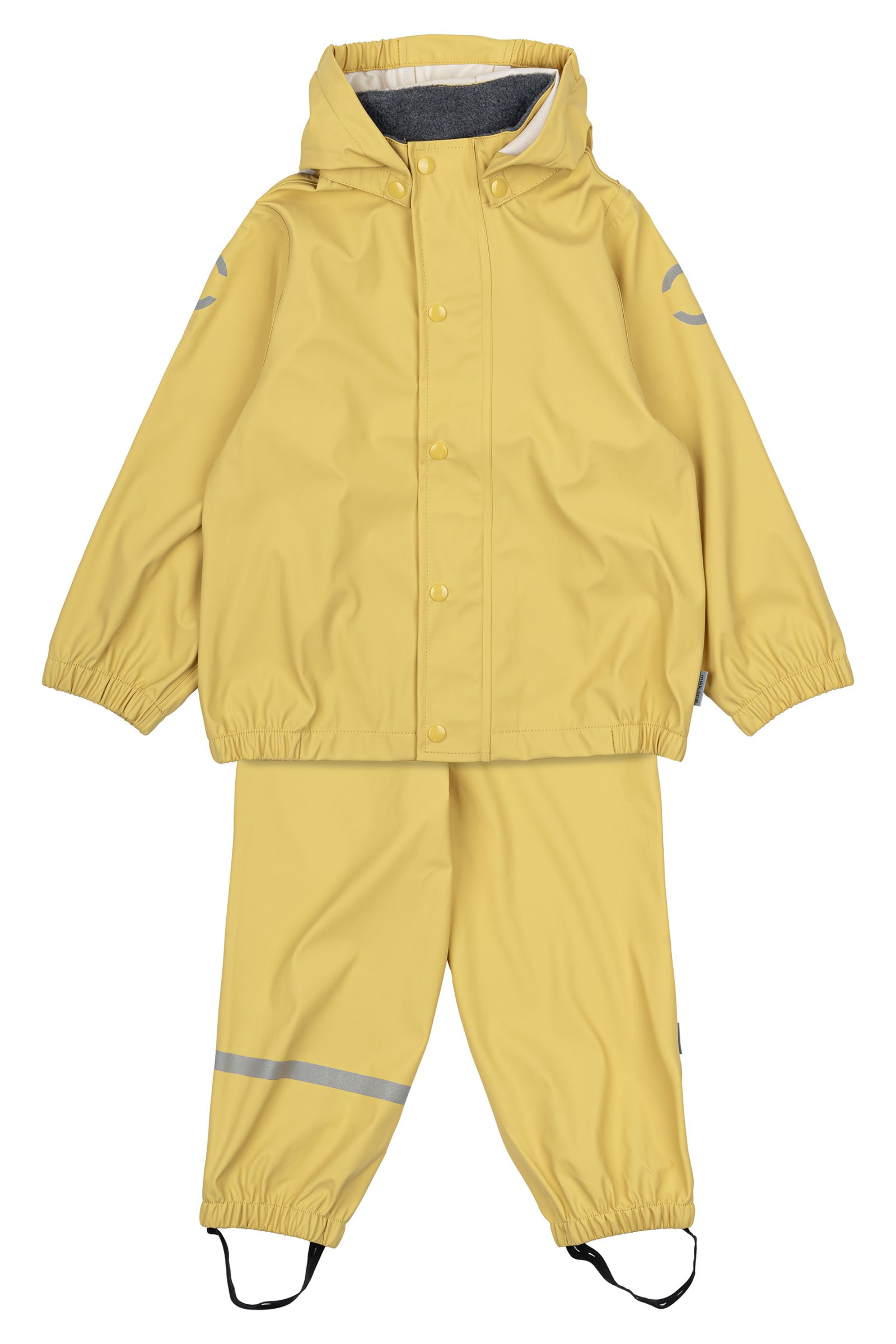 Alt regntøj fra mikk-line er recycled, da vi ønsker at passe på miljøet. Dette regnsæt er vind- og vandtæt med svejsede sømme overalt. Sættet består af en regnjakke og et par regnbukser med seler. Selerne kan justeres og lukkes med klikspænder. Placer fodstropperne under gummistøvlerne for at holde fødderne tørre. Alt regntøj er udstyret med refleks detaljer så dit barn trygt kan færdes i trafikken.