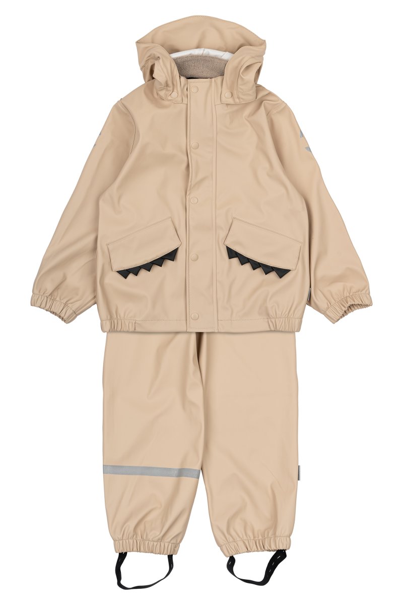 Charmerende PU regntøj med seler fra mikk-line. Sættet består af en vandtæt regnjakke og regnbukser, der begge er lavet af 100% genanvendt og blødt PU-materiale. Regntøjet er skabt til at børn kan trodse regnen og have det sjovt med at hoppe i vandpytter, glide ned ad den våde rutsjebane, lege i den våde sandkasse osv. Placer de justerbare fodstropper under støvlerne, for at holde fødderne tørre og undgå at bukserne glider op. Selerne kan tilpasses efter behov, og så har sættet har et indvendigt navneskilt med plads til mere end ét navn, så giv det gerne videre, så endnu et barn kan få glæde af det. Jakken har desuden et pyntende og fint dyreprint, der giver et ekstra sødt udtryk.