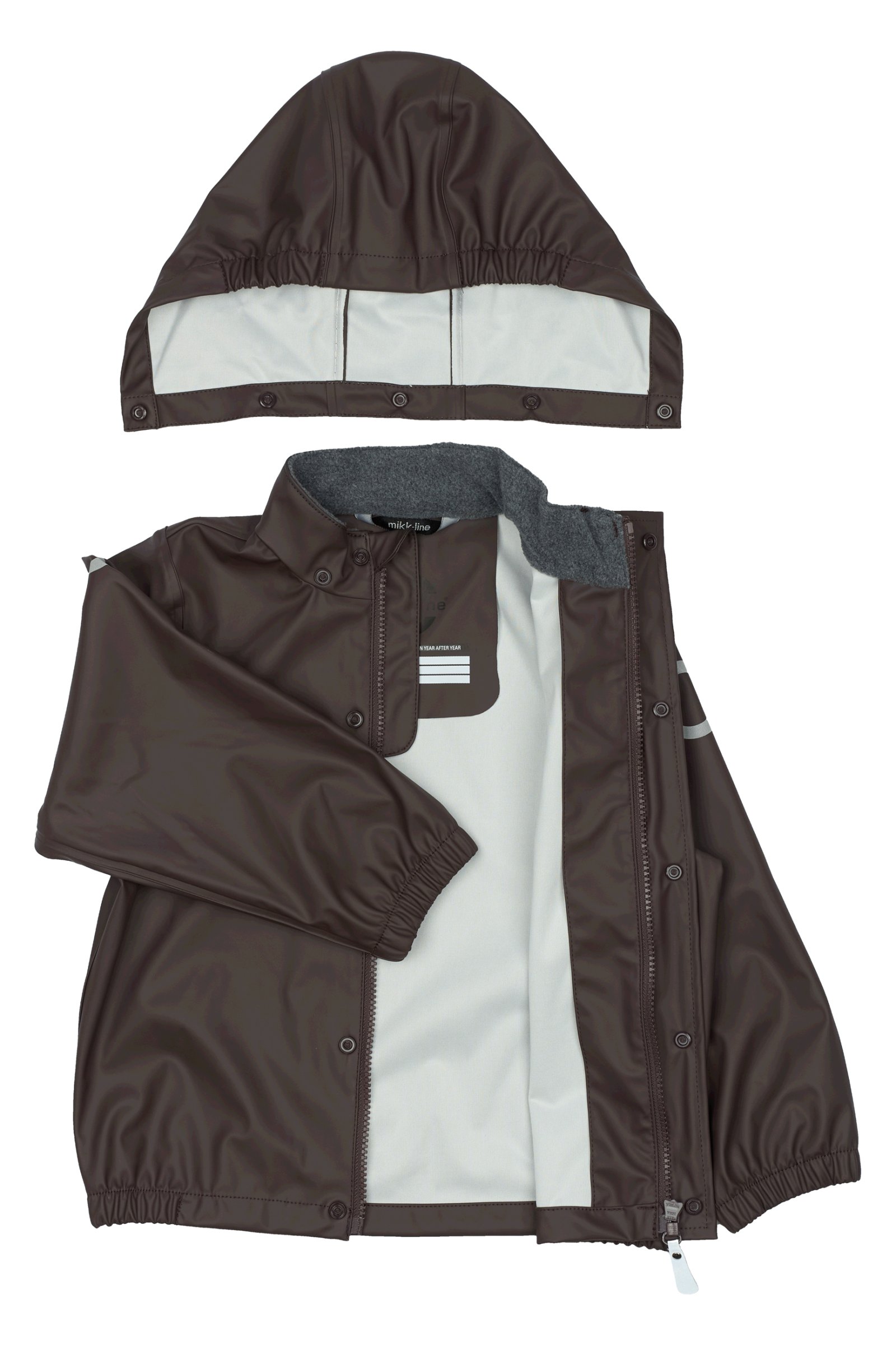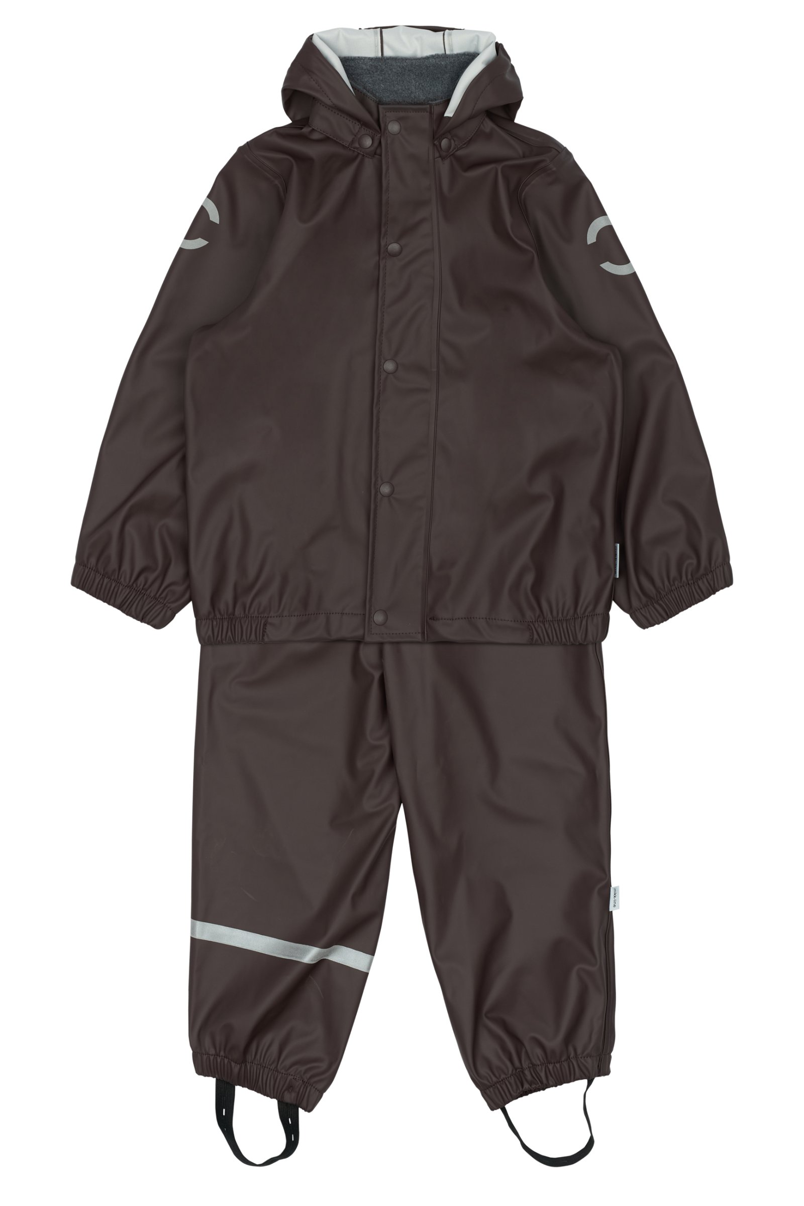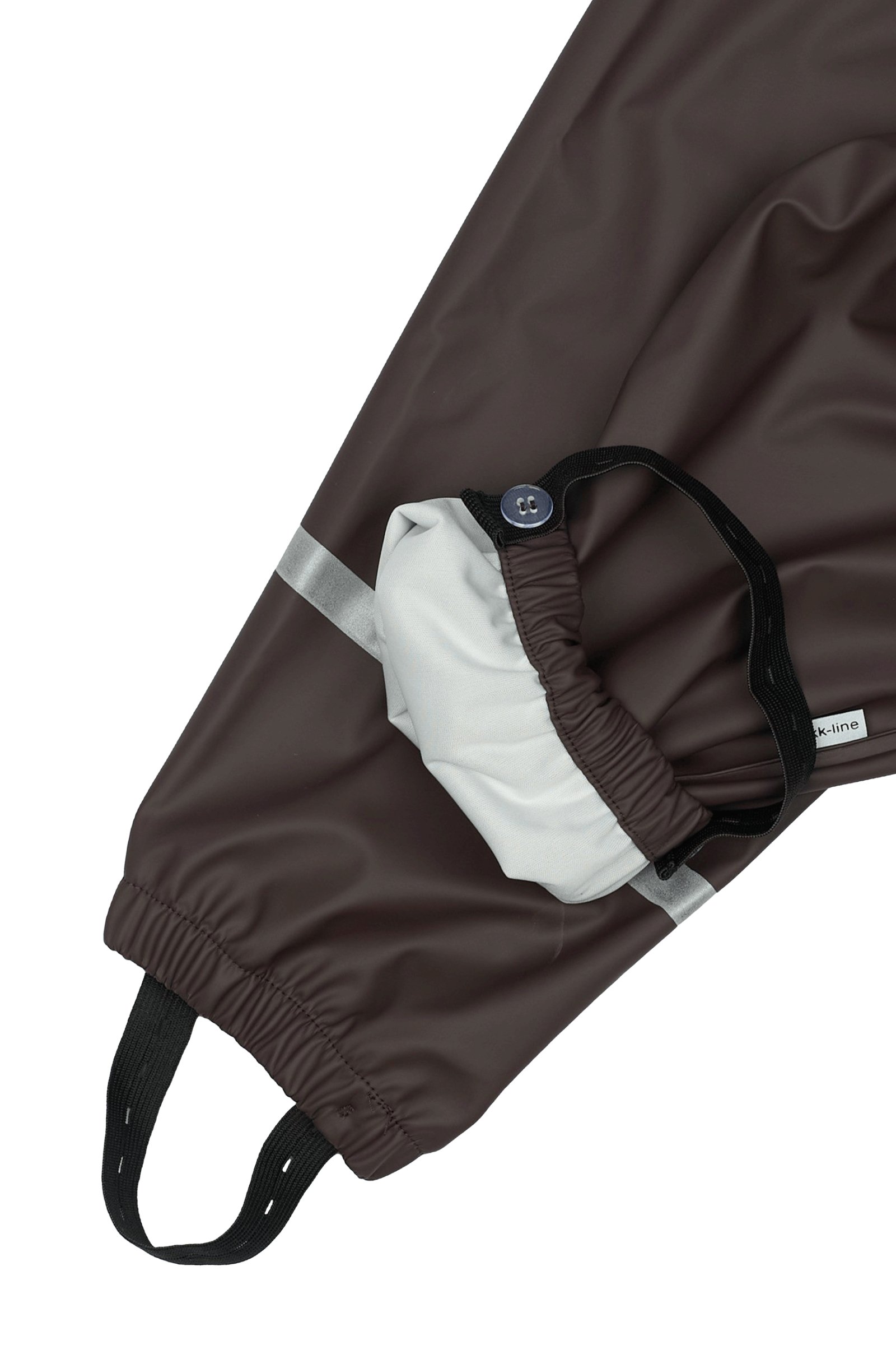 Placer fodstropperne under gummistøvlerne for at holde fødderne tørre. Alt regntøj er udstyret med refleks detaljer så dit barn trygt kan færdes i trafikken.