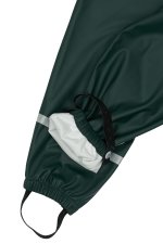 Placer fodstropperne under gummistøvlerne for at holde fødderne tørre. Alt regntøj er udstyret med refleks detaljer så dit barn trygt kan færdes i trafikken.
